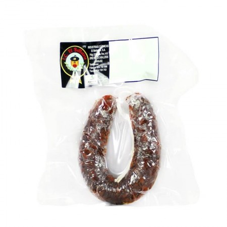 Tradicional chorizo ibérico extremeño de herradura o sarta elaborado artesanalmente con carnes y grasas seleccionadas de cerdos ibéricos y aliñado con sal, ajos extremeños y pimentón de la Vera dulce.