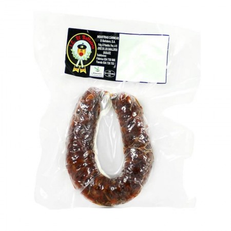 Tradicional chorizo ibérico extremeño de herradura o sarta elaborado artesanalmente con carnes y grasas seleccionadas de cerdos ibéricos y aliñado con sal, ajos extremeños y pimentón de la Vera picante.