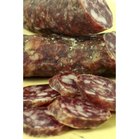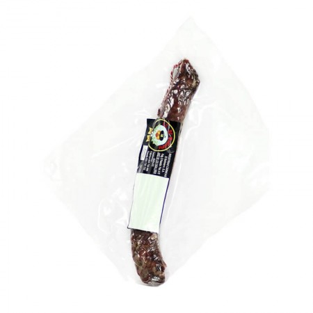 Tradicional fuet ibérico extremeño elaborado de manera artesana con sal y pimienta negra.