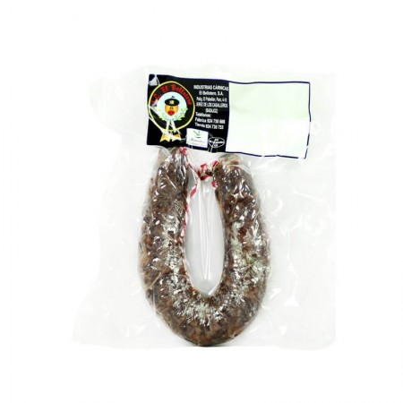 Tradicional salchichón ibérico extremeño de herradura o sarta elaborado con carnes y grasas seleccionadas y aliñado con pimienta negra y sal.